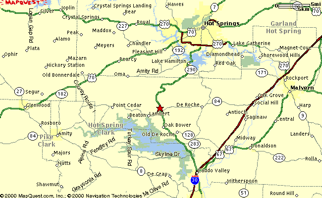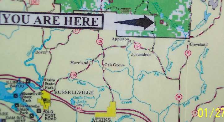 Map to the town of Jerusalem, Ark. This is the jumping off spot for the road into Brock Creek. I-40 in the bottom of the picture is the stretch between Ft. Smith and Little Rock.